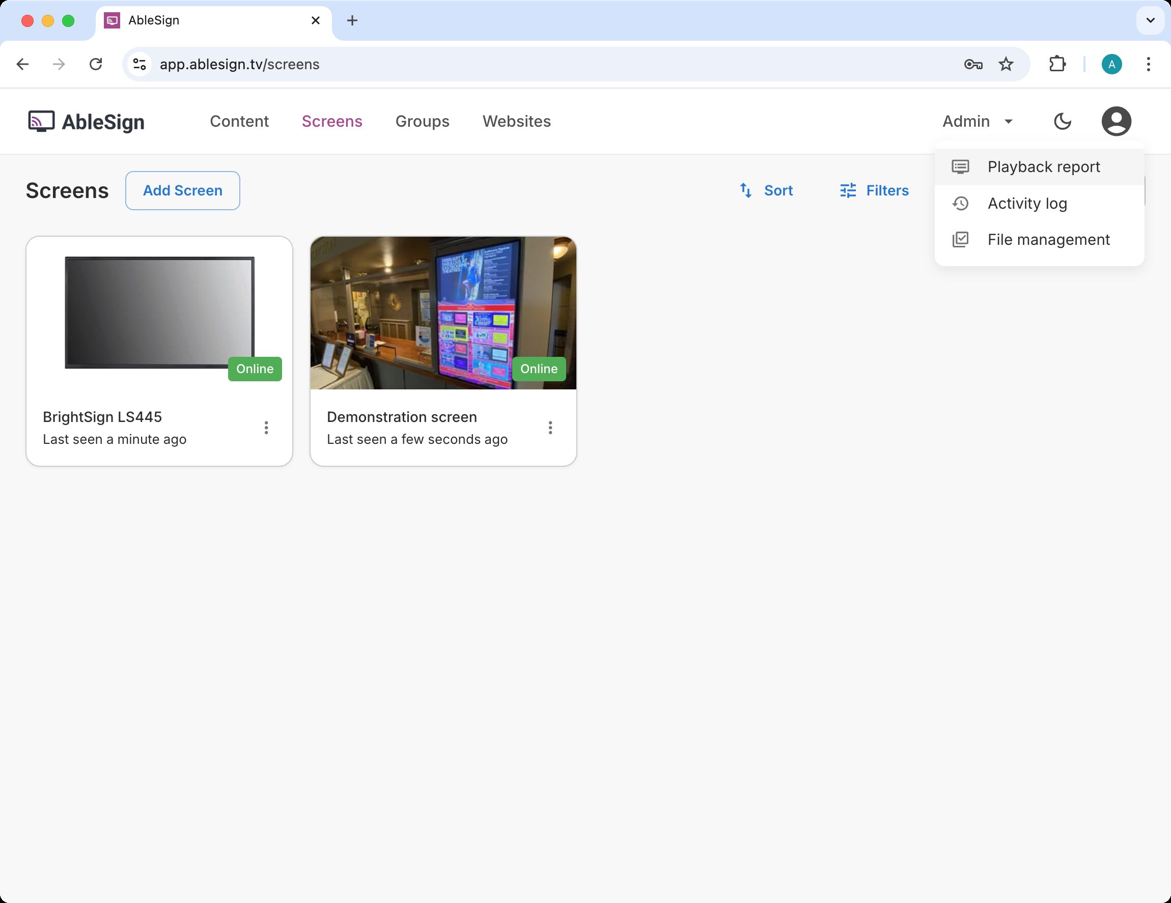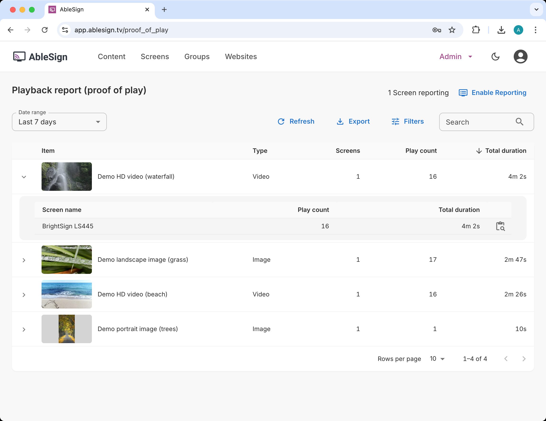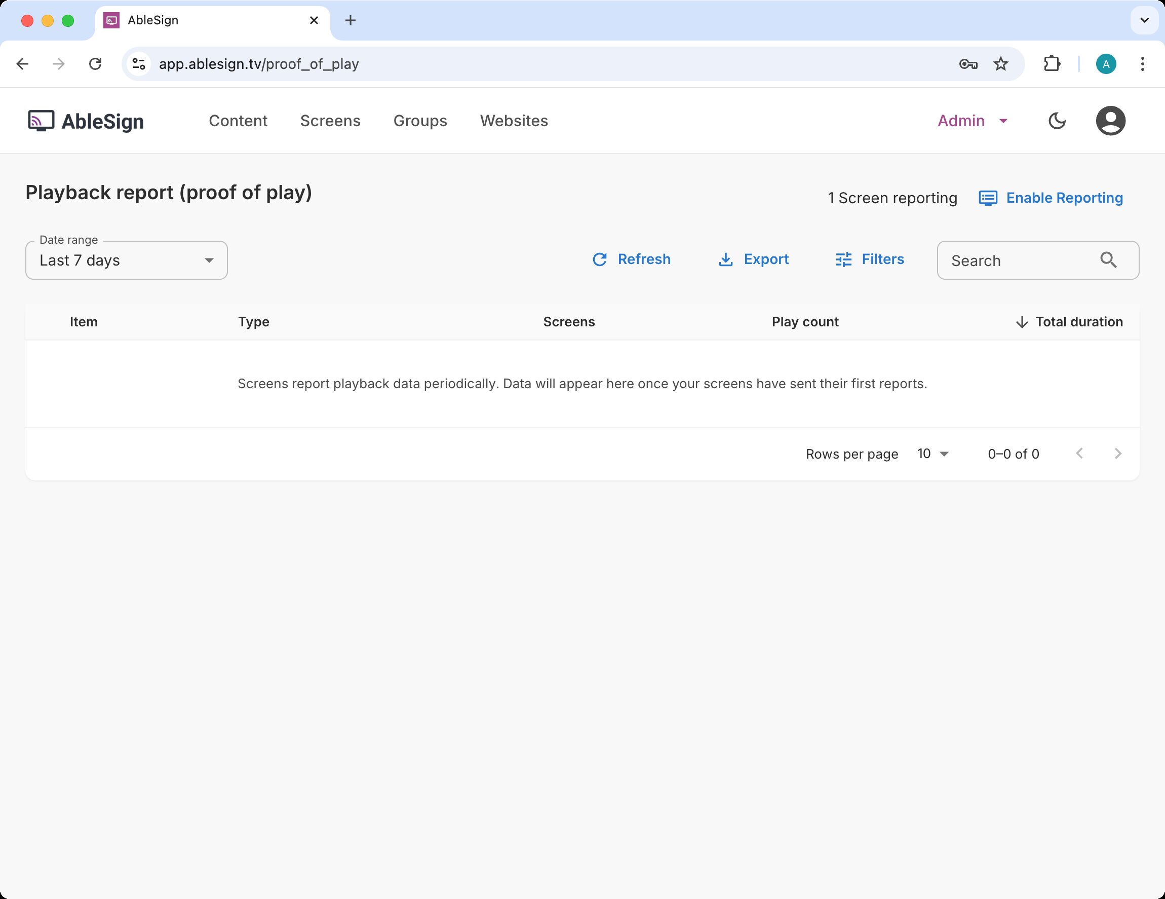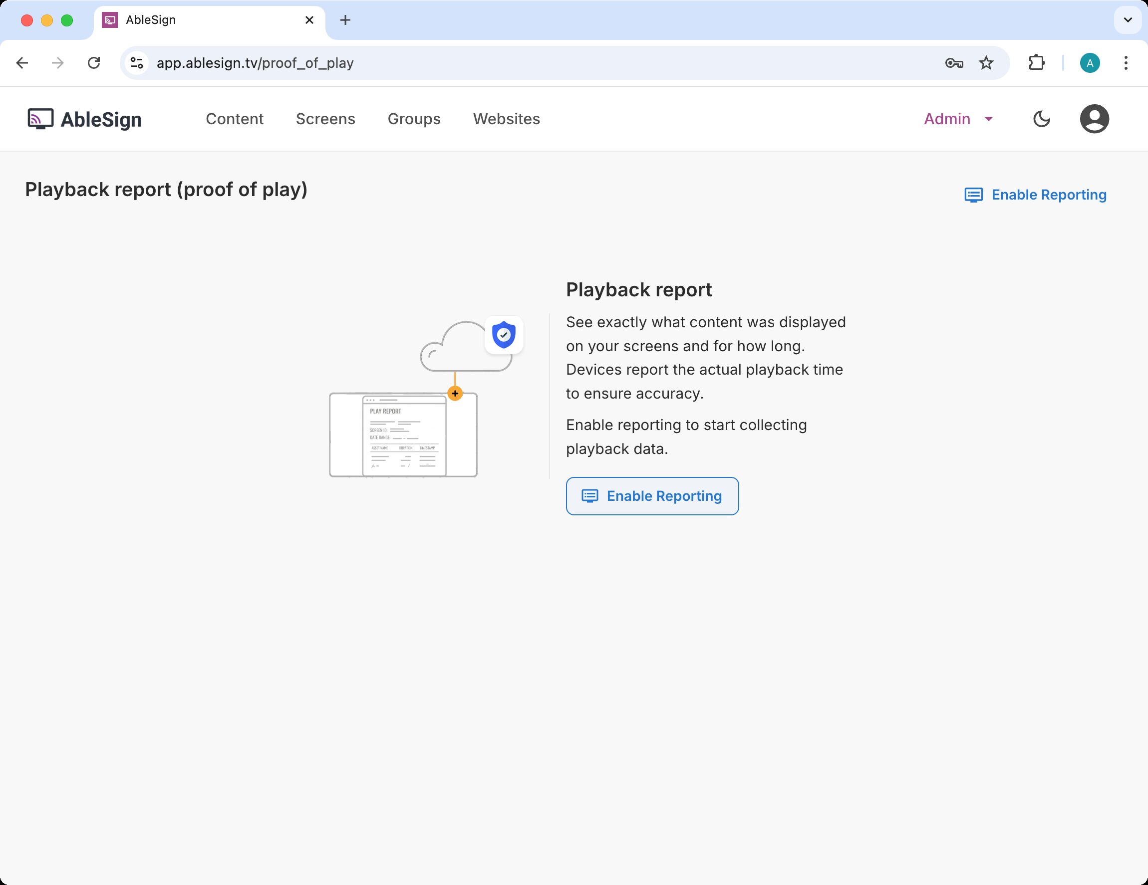 Version 2.4.5 or later of the AbleSign player app is required to support proof of play reporting.