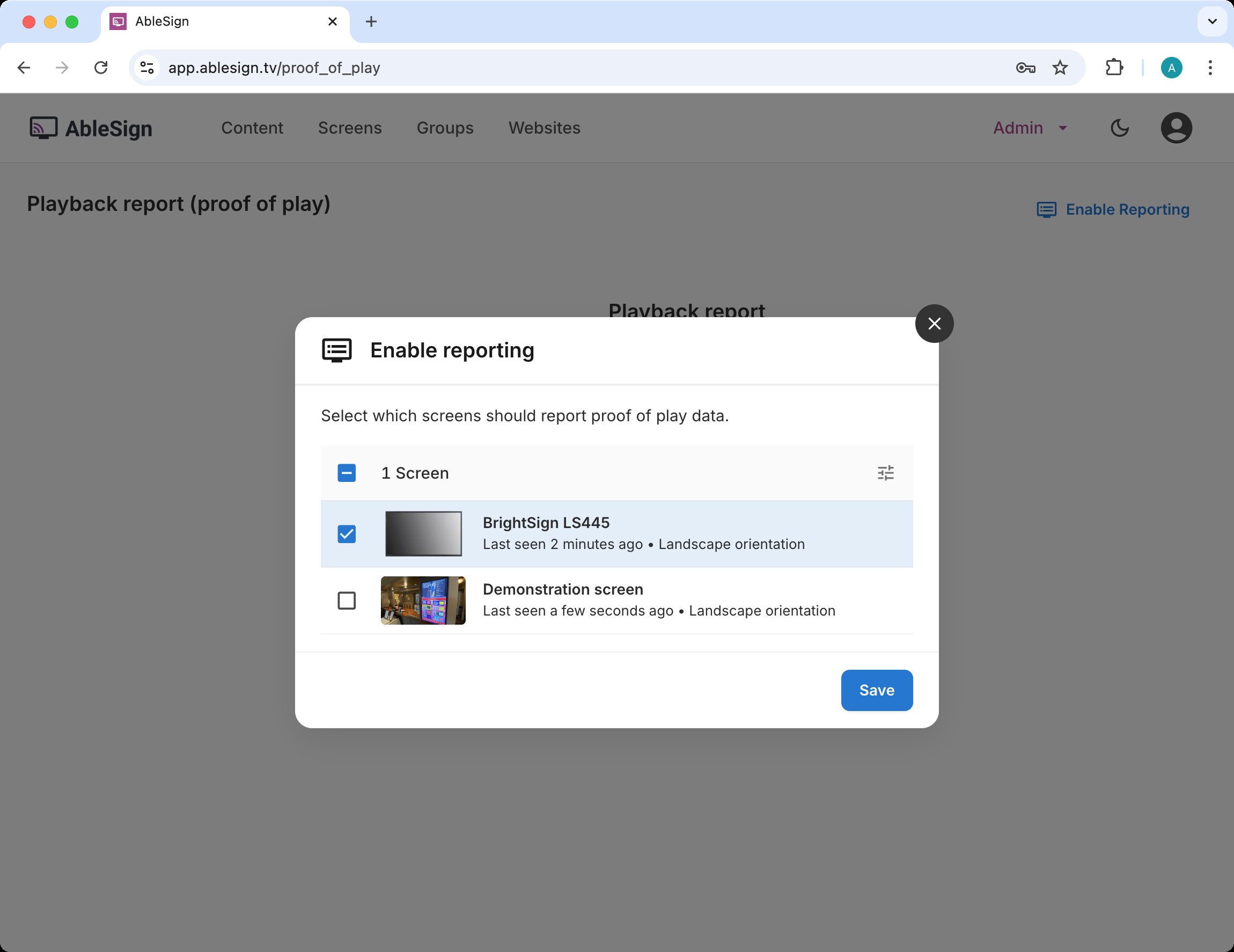 The screen selector will appear. Select the screens that you would like to report proof of play. Bear in mind that there will be extra load on the device so for devices with very little memory this may not be advisable. When done press Save